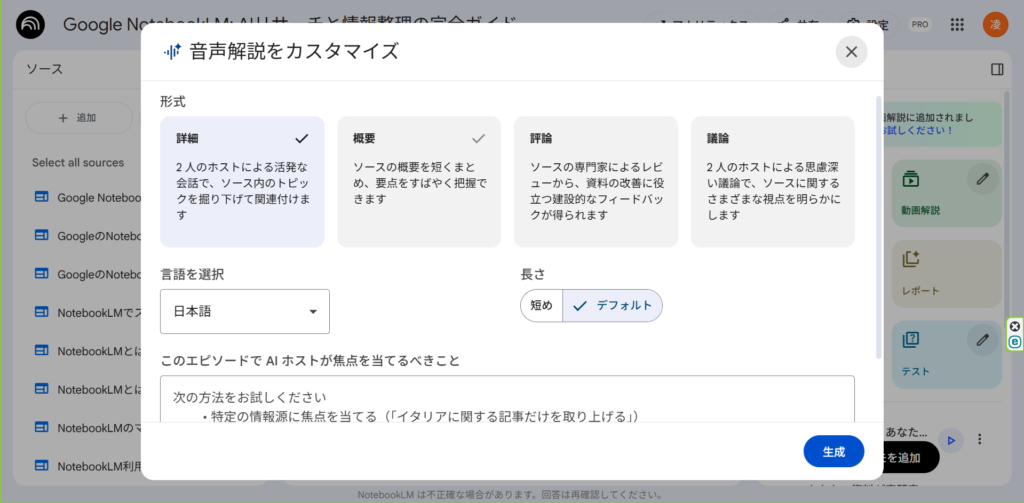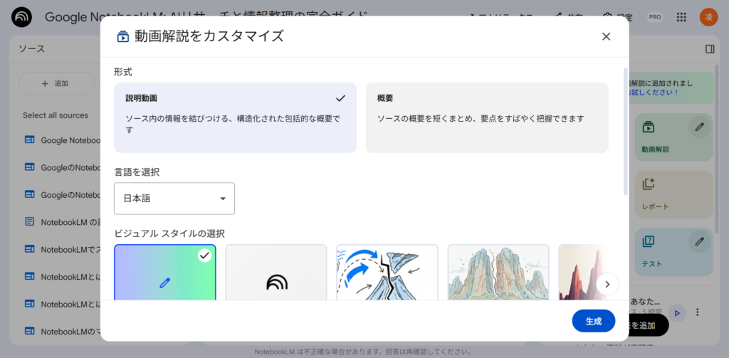 テキストや音声だけでは分かりにくい複雑な情報は、動画でインプットするのが一番です。この機能を使えば、説明動画と概要を選択可能で、約10分程度の解説動画をAIが自動生成してくれます。言語や動画の見た目もカスタマイズ可能で、ビジュアルで直感的に理解したい場合に最適な機能と言えるでしょう。