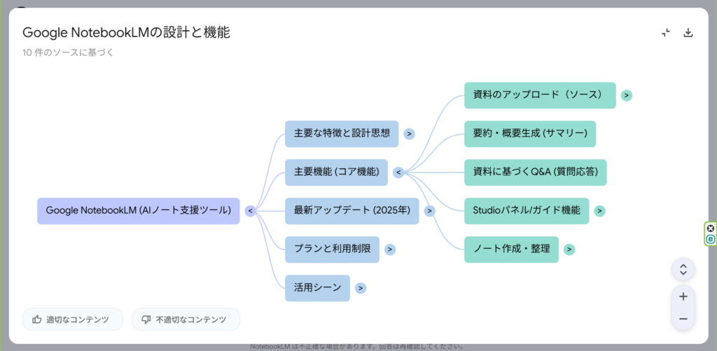 ここでの体験は、従来のAIチャットとは一線を画す、NotebookLMならではの優れた特徴がいくつもあります。