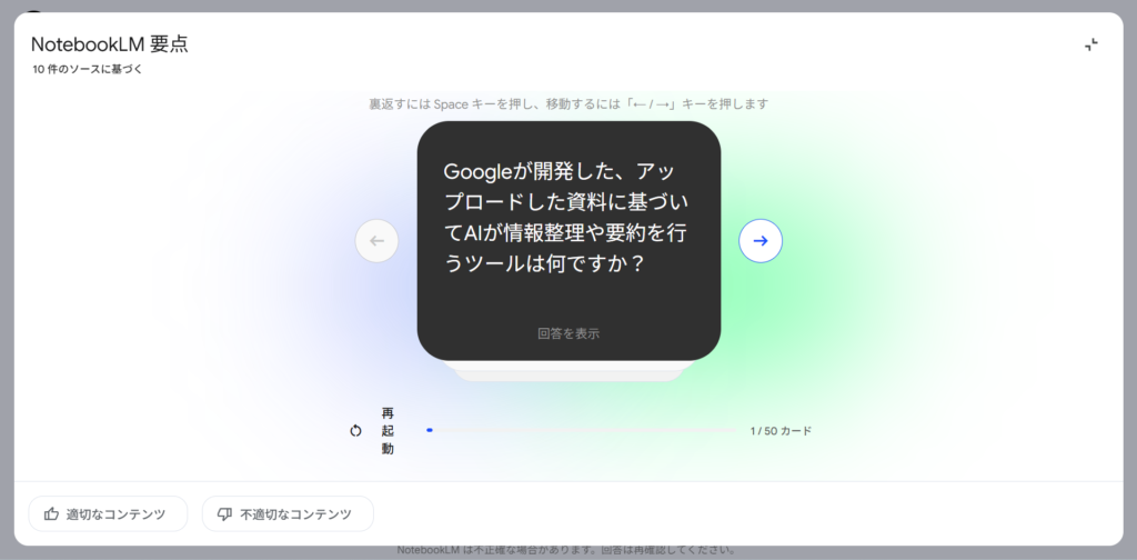 NotebookLMは、学習支援ツールとしても非常に優秀です。資料の内容を元に、重要な用語や概念を覚えるための暗記カード(フラッシュカード)や、理解度をチェックするためのテストを自動で作成してくれます。資格試験の勉強や、研修内容の復習に絶大な効果を発揮します。