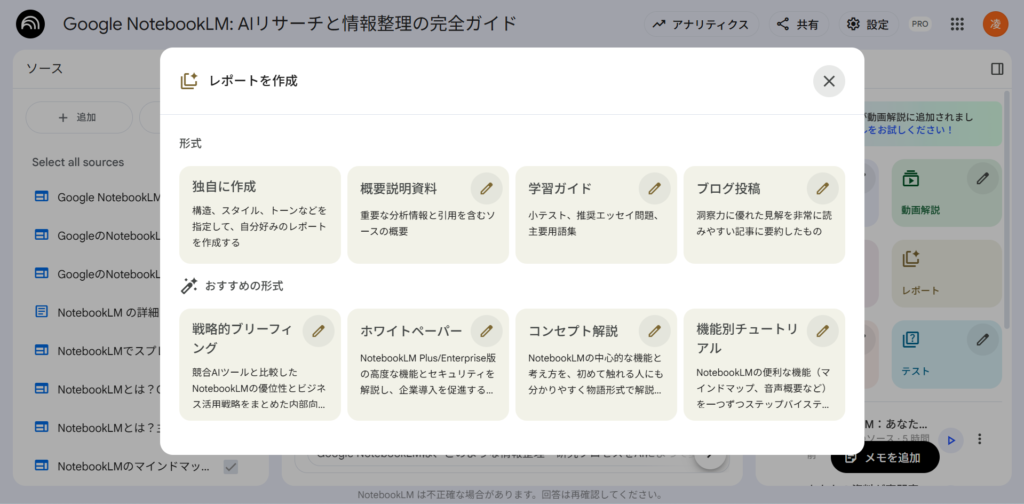 「もっと詳しく」「この部分に焦点を当てて」といった指示を追加して、レポートの内容を自由にカスタマイズすることも可能です。