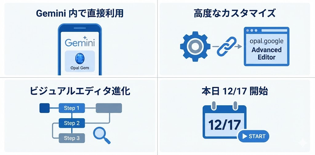 Googleは2025年12月16日(現地時間)、AIを活用したミニアプリ作成ツール「Opal」を、Geminiウェブアプリ内で実験的なGemとして直接利用できるようになったことを発表しました。