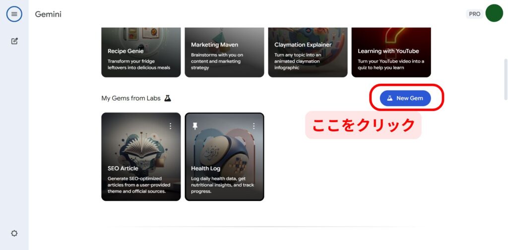 ステップ1:まずは、Gemの画面を開き、「New Gem」をクリックします。