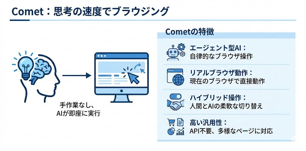 Cometは「思考の速度でブラウジング」というコンセプトのもと開発されました。これは、ユーザーが頭に思い描いた目的を、複雑な手作業なしにAIが即座に実行する、という新しいブラウジング体験を目指すものです。