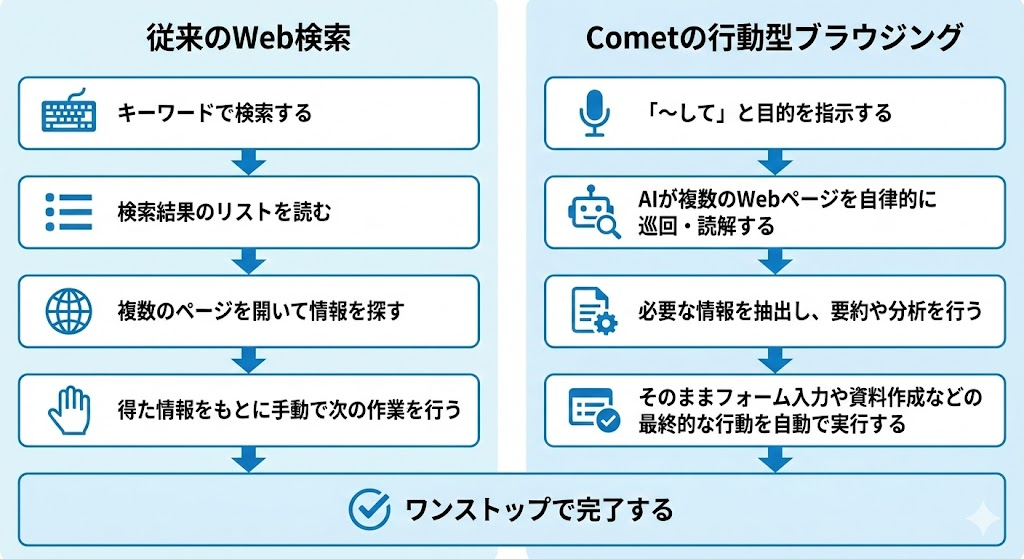 一方、Cometが提唱するのは行動型ブラウジングです。これは、単に情報を探すのではなく、目的を達成することに主眼を置いています。