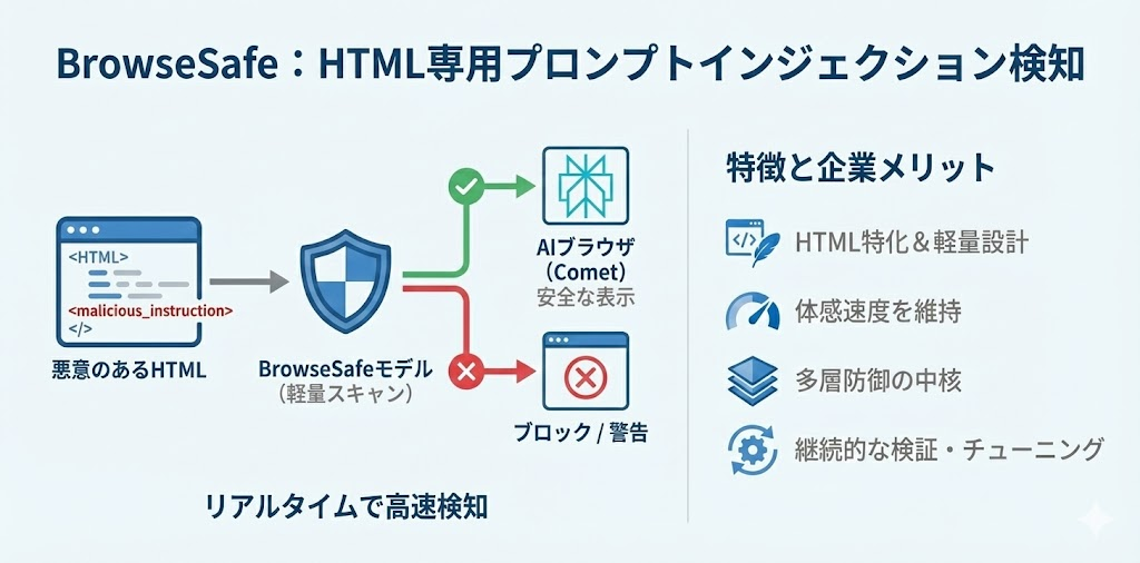 BrowseSafeは汎用LLMではなく「HTMLに特化した軽量モデル」として設計されています。これにより、Cometのようなブラウザエージェントがページを読み込むたびにリアルタイムでスキャンしても、体感速度をほとんど損なわずに危険なページだけをブロック/警告できる点が特徴です。