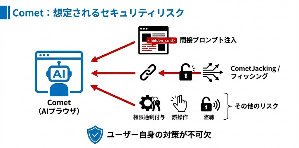 これらのリスクは、Cometに限らず、すべてのエージェント型AIに共通する課題であり、ユーザー自身が対策を講じることが不可欠です。
