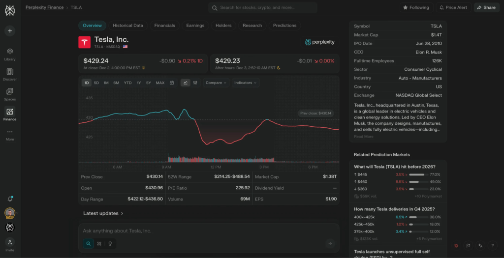 12月に強化された「Perplexity Finance」は、個人投資家や金融機関の担当者、IR・経営企画部門におすすめの機能です。