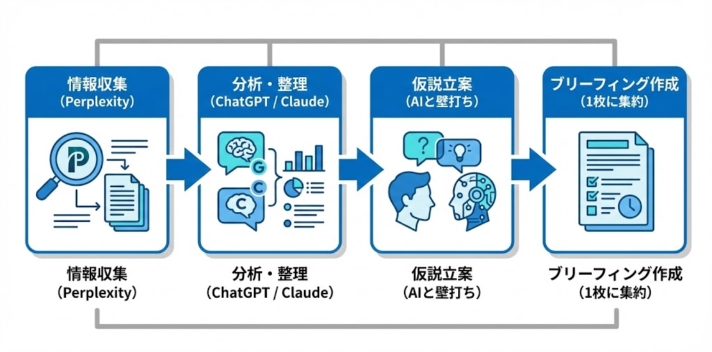 - 分析・整理:ChatGPTやClaudeで収集した情報を整理・分析