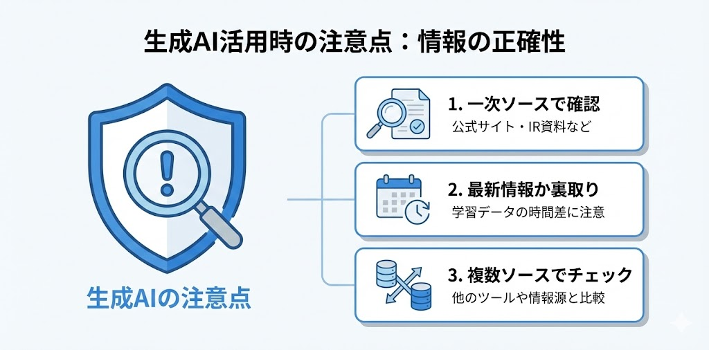 AIが生成した情報は、必ず一次ソース(企業の公式サイト、IR資料、プレスリリースなど)で確認しましょう。特に数字や日付は、ハルシネーション(AIが事実でない情報を生成すること)のリスクがあります。