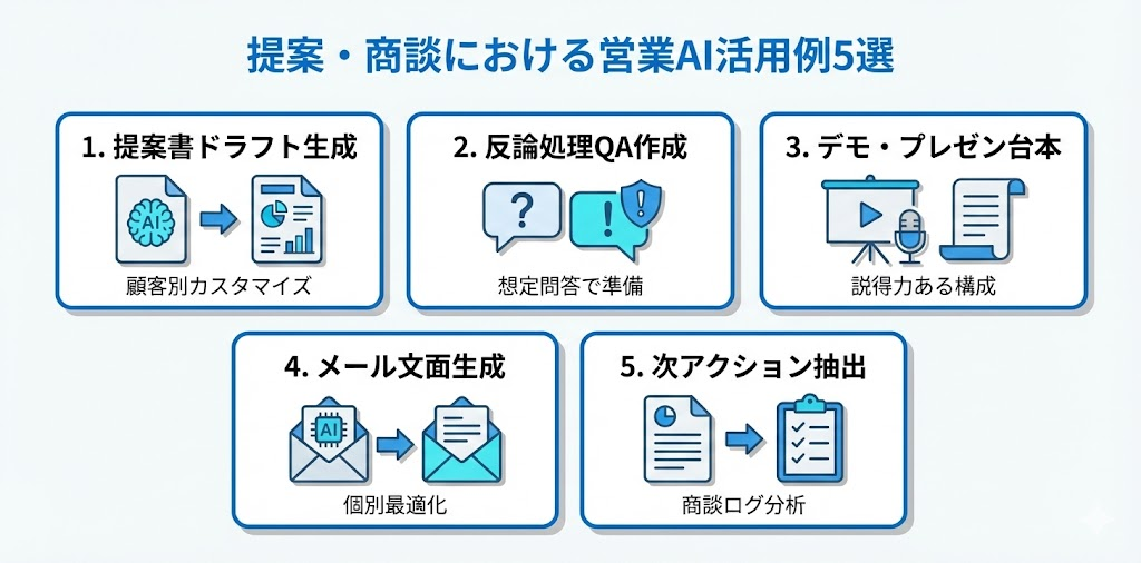 | フェーズ2:提案・商談 | 提案書作成 営業トーク準備 商談シミュレーション | 資料作成 トーク準備の支援 |