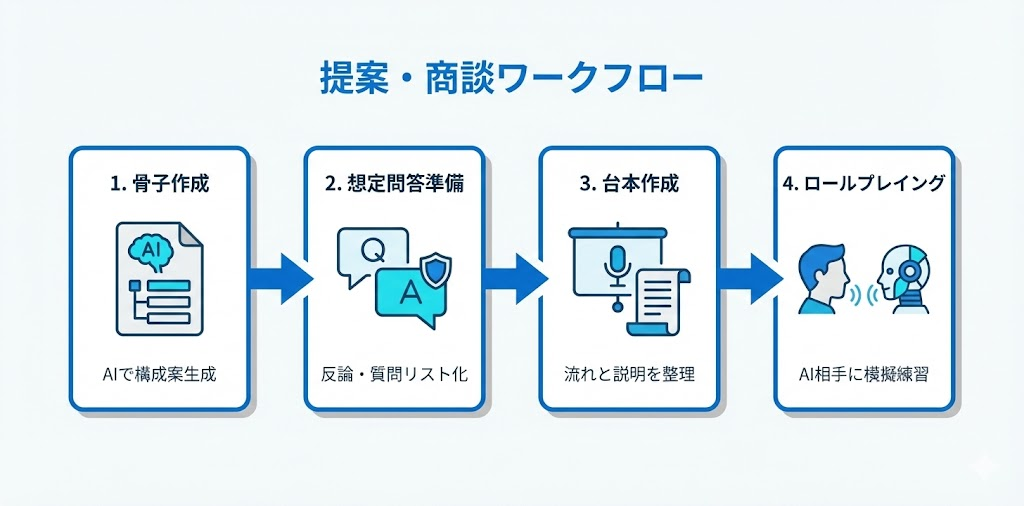 リサーチで得た情報をもとに、実際の提案・商談で成果を出すフェーズです。ここでも生成AIは、提案書の作成から商談のシミュレーションまで、幅広くサポートしてくれます。