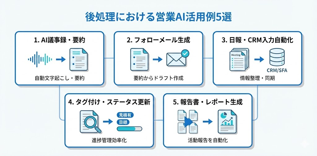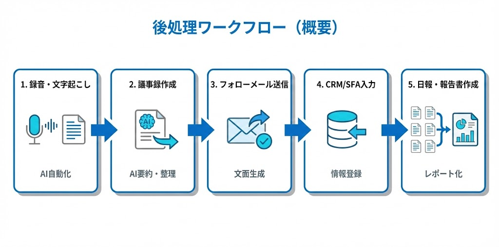 | フェーズ3:議事録・フォロー・日報など後処理 | 議事録作成 フォローメール 日報 CRM入力 | 後処理業務の自動化 |