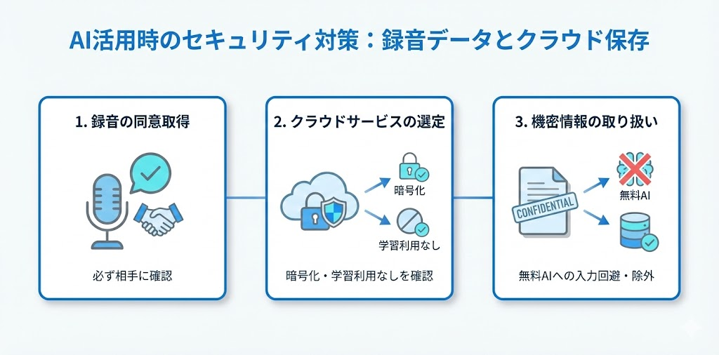 AIを業務で活用する際、最も注意すべきなのがセキュリティです。特に営業活動では、顧客情報や商談内容など機密性の高い情報を扱うため、慎重な対応が必要です。
