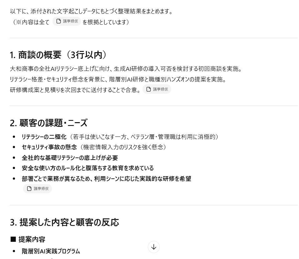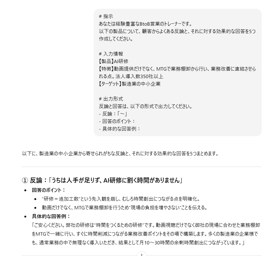 - 商談仮説のブレインストーミング:「この顧客に何を提案すべきか?」「どんな課題を抱えているか?」といった仮説を、AIと壁打ちしながら練り上げることができます。