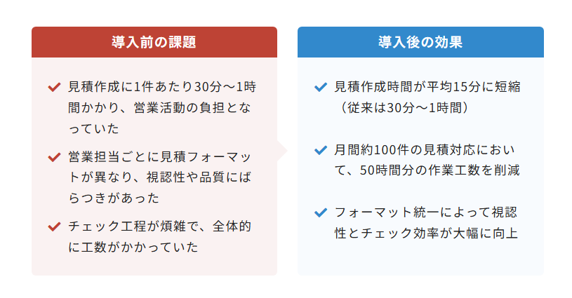 見積作成業務にAIを活用し、見積作成時間を15分に短縮。営業工数を月50時間削減することに成功しました。これにより、営業担当者は顧客との商談やフォローアップに注力できる時間が大幅に増加しています。
