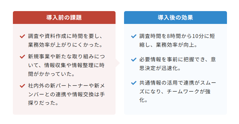 - 顧客・業界リサーチ:顧客企業のWebサイト、プレスリリース、IR情報などを分析し、事業概要、経営課題、最近の動向などを短時間で把握できます。