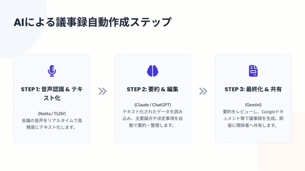 まずは、全ての基本となる「議事録」の自動化です。ここを制する者が営業の生産性を制します。