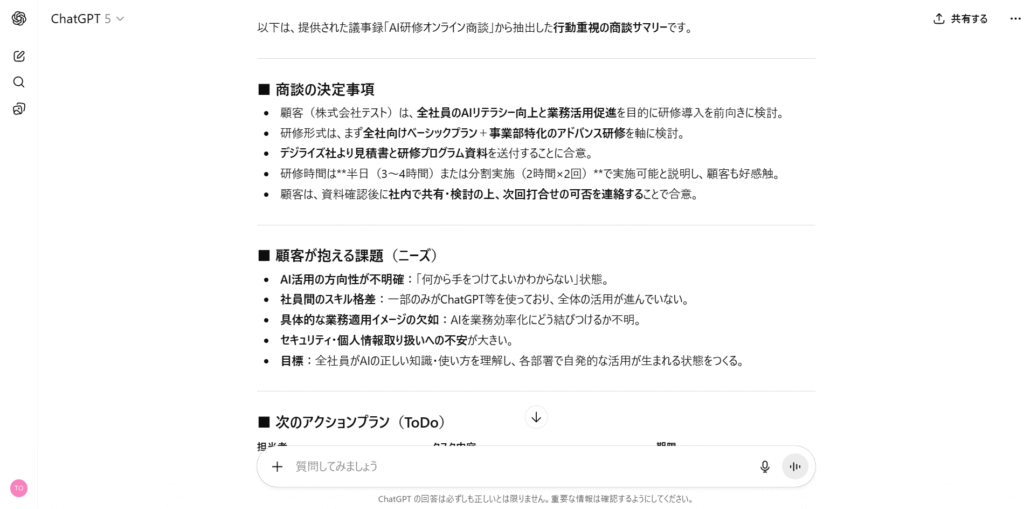実際にサンプルの文字起こしを作成し、このプロンプトをChatGPTで試してみました。決定事項や顧客の課題がしっかり整理されていることがわかります。