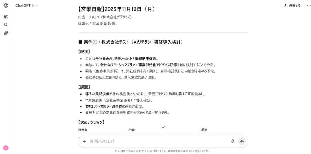 実際に、2社分サンプルで議事録を作成し、それをこのプロンプトに入れてみました。一読するだけで状況把握できる日報が完成しました。